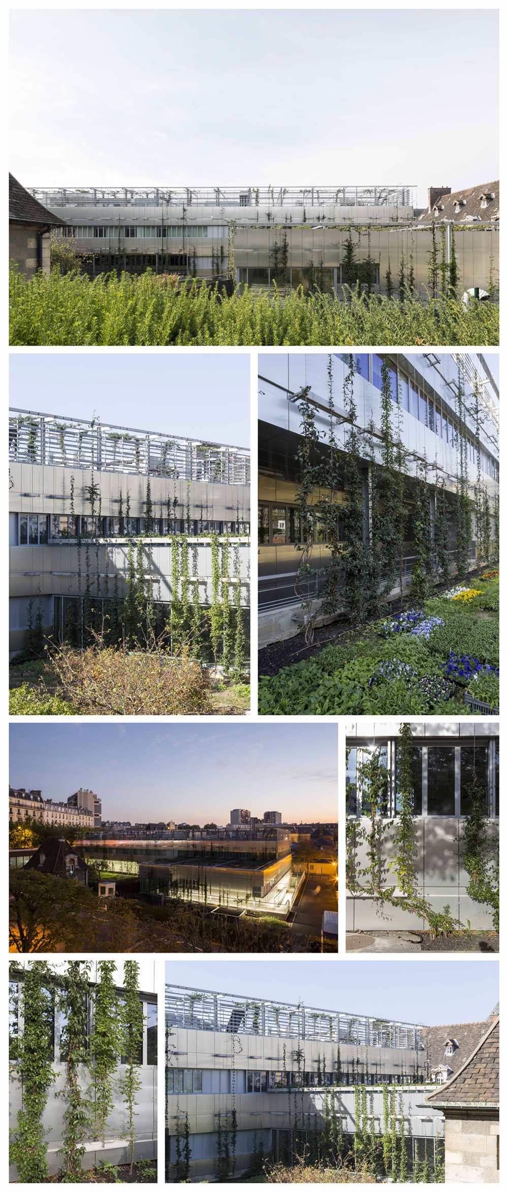 Al Meary Institute Université Paris Diderot Hôpital Saint-Louis Paris, invece, sono predominanti l’ombreggiatura e salvaguardia della biodiversità. Anche questo progetto è stato curato dallo studio Jakob+MacFarlane. Il Meary Institute Université Paris Diderot Hôpital Saint-Louis Paris è costruito sulle tracce di un precedente edificio degli anni Settanta di cui sono state mantenute le fondazioni. Il progetto è centrato sulla biodiversità e sull’integrazione della vegetazione e del verde. Esaminando le piante storiche del sito dei sec. XVI e XVII, sono stati ritrovati i giardini di lavoro per l’ospedale nei primi secoli. Alcuni resti permangono tuttora accanto all’edificio e sono stati preservati.