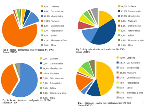 Attualmente la produzione di energia è attribuita per il 34% al petrolio, 26% carbone, 24% di gas, 9% di vento, 6% di energia nucleare, 1% di energia solare, biomassa e geotermica, e 2% di energia idroelettrica anche se il contesto varia da paese a paese, confrontando Francia (Fig. 1), Italia (Fig. 2), Svizzera (Fig. 3) e Germania (Fig. 4).